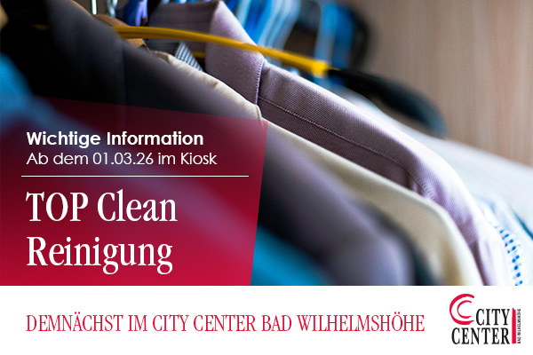 Ab dem 01.03.2026 finden Sie die TOP Clean Reinigung im Kioskbereich des City Centers Bad Wilhelmshöhe.Das Unternehmen war zuvor in der Rolandstraße ansässig und steht